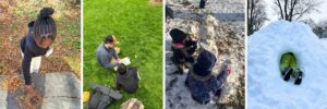 Throughout the fall and winter, students have been learning through play, exploration, and hands-on discovery. They have investigated seeds and leaves, used magnifying glasses to look closely at insects and the tiny signs of life all around them, and built shelters designed to withstand wind and rain. As the weather shifted, students tracked animal signs in snow and ice, learned how animals prepare for winter through migration, hibernation, and adaptation, and worked together to build snow structures and tunnels. These shared adventures spark joy and deepen students’ connection to the natural world. As one student exclaimed, “I will come here 200 more times, I’m having so much fun!” Another held up a leaf to the light and declared, “The leaves are my friends.”